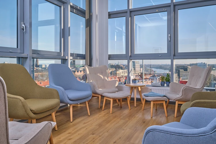 Mitten im historischen Schlachte-Viertel an der Weser liegt unsere Oberberg Tagesklinik Bremen. Klare, minimalistisch gestaltete Räume schaffen Ruhe und Fokus. Der Blick von unseren Etagen im Jacobs-Tower lädt zum Durchatmen ein.